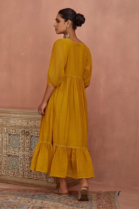 Multi-colored floral hand embroidery on the yoke, Puffed sleeves for a trendy look, Tiered hem for added flair