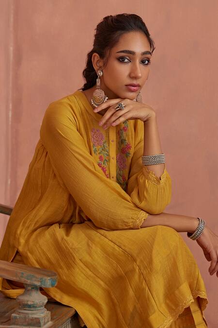 Yellow kurta featuring floral hand embroidery on the yoke with side pockets. Paired with cotton silk pant and a cotton slip.