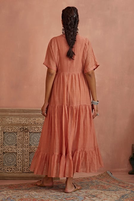 3D floral thread hand embroidery on yoke, Block printed pattern, Flared silhouette with tiered design