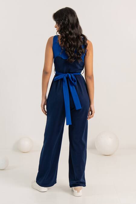 Blue jumpsuit featuring an asymmetric neckline and a relaxed fit. Comes with a detachable belt for added style.