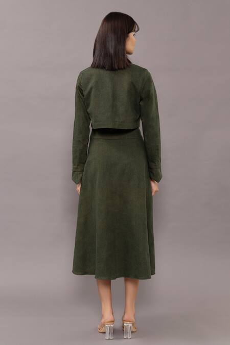 Green cropped denim jacket featuring a button embellished collar. Paired with a V-neck crop top and side pocketed A-line midi skirt with attached lining.