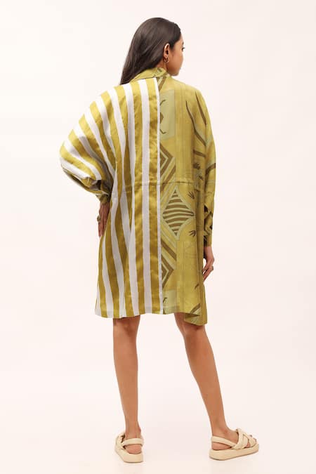 Olive green cotton silk shirt dress featuring floral, paisley, geometric & striped prints