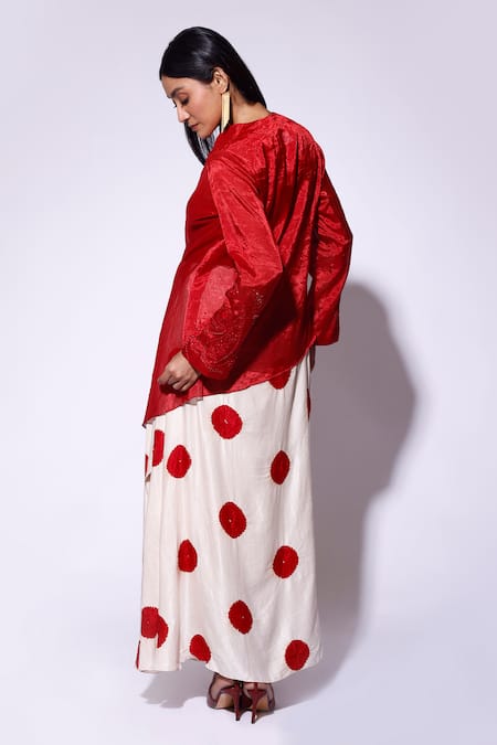 Buy_Kritika Murarka_Red Silk Cut Work V-neck Floral Embroidered Top