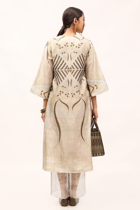 Buy_Kritika Murarka_Green Handloom Cotton, Linen V-neck Floral Print Tunic _Online_at_Aza_Fashions