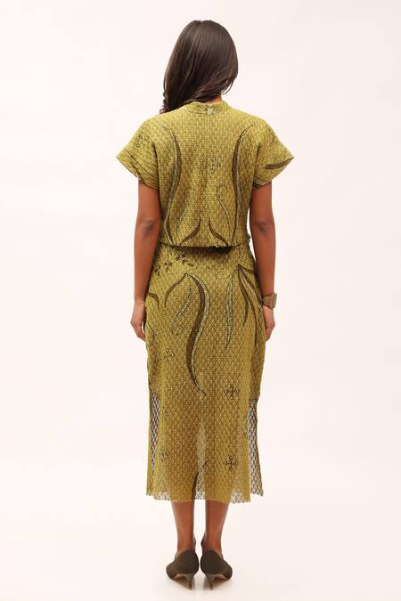 Olive green crop top in cotton net featuring a high neckline and short sleeves with floral, paisley & geometric prints. Paired with a matching high-rise skirt that has raw edges and side slits, along with side pockets.