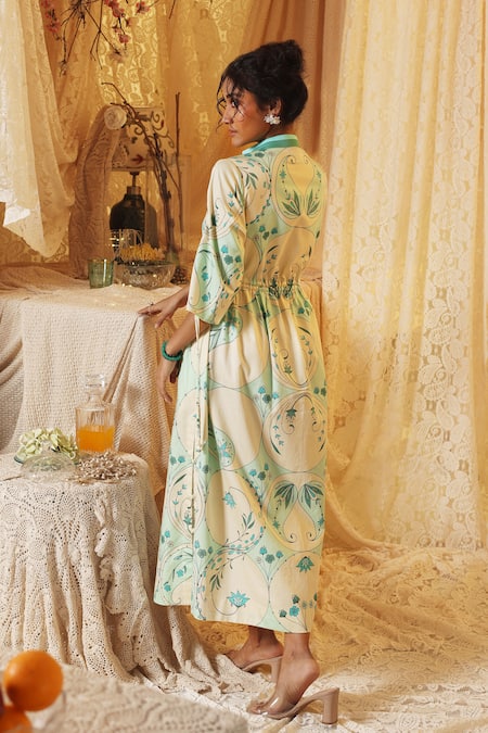 Buy_Kritika Murarka_Mint Cotton Collared Circle Print Drawstring dress _Online_at_Aza_Fashions
