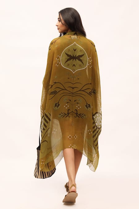 Olive green chiffon shirt dress featuring floral, paisley, and geometric prints with knot detailing. Comes with a taffeta inner for added comfort.