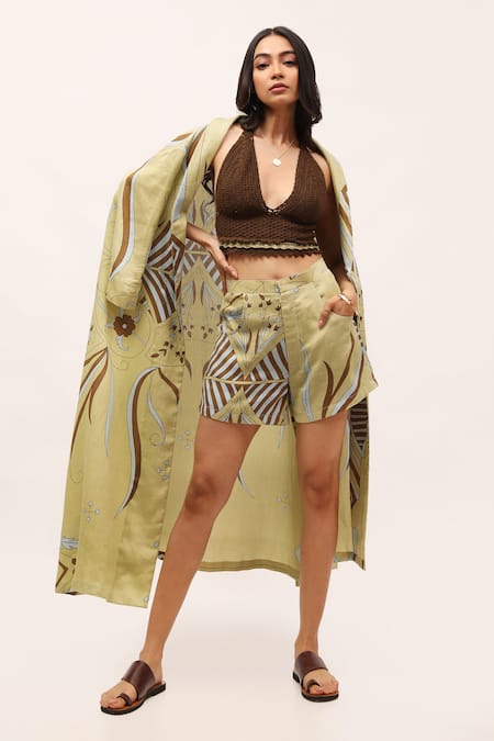 Buy_Kritika Murarka_Green Cotton Satin Printed Floral Shorts _Online_at_Aza_Fashions