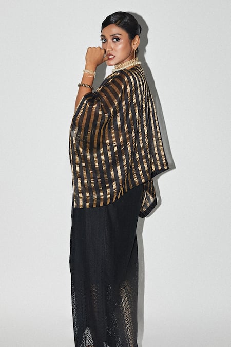 Black kaftan top featuring zari stripe woven motifs and thread embroidery in paisley and floral patterns
