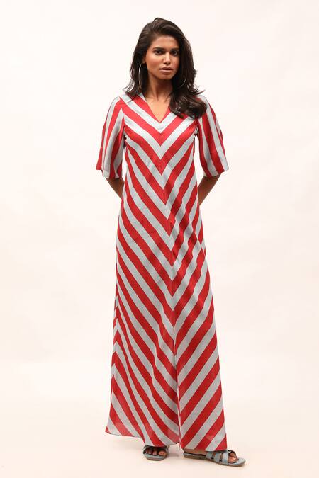 Buy_Kritika Murarka_Blue Cotton, Silk V-neck Striped Print A-line Dress_Online_at_Aza_Fashions
