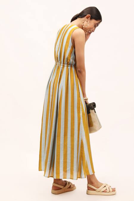 Buy_Kritika Murarka_Yellow Cotton, Silk V-neck Striped Print Dress_Online_at_Aza_Fashions
