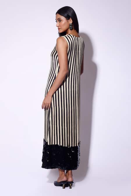 Black midi dress featuring a V neck and sleeveless design with an all-over striped print