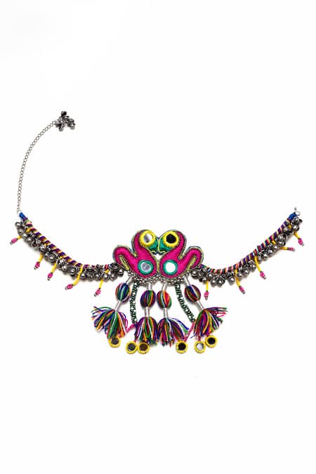 Pink choker featuring intricate thread embroidery with beads, mirror, and ghunghroo tassels