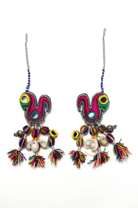 Attached ear chain with ghunghroo-shell tassels, Vibrant thread embroidery in peacock design, Mirror embellishments for added sparkle.