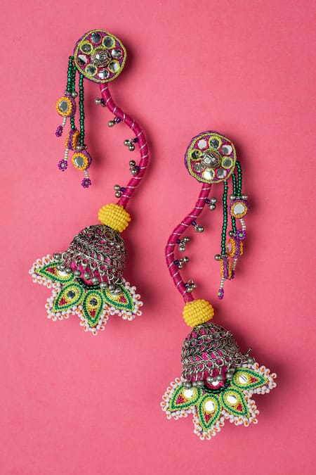 Jhumka detailing with intricate embroidery, Flexible wire hanging for comfort, Colorful bead embellishments
