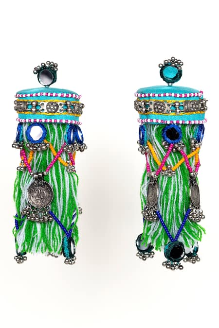 Colorful thread tassels with bead and mirror embellishments., Oxidised metal components with coin accents.