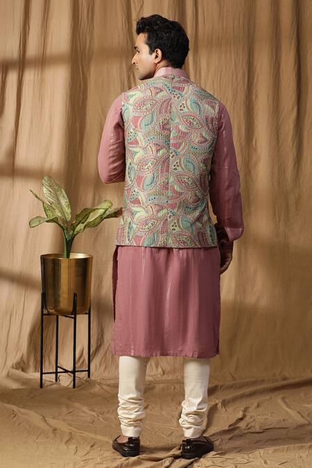 Pink Silk Embroidered Thread Asymmetric Bundi Kurta Set