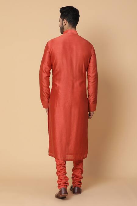 Orange panelled kurta featuring a mandarin collar and full sleeves. Paired with a churidar in a matching hue.