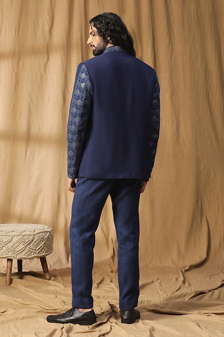 Blue bandhgala featuring mirror and resham embroidery with a band collar. Paired with a textured cotton pant.