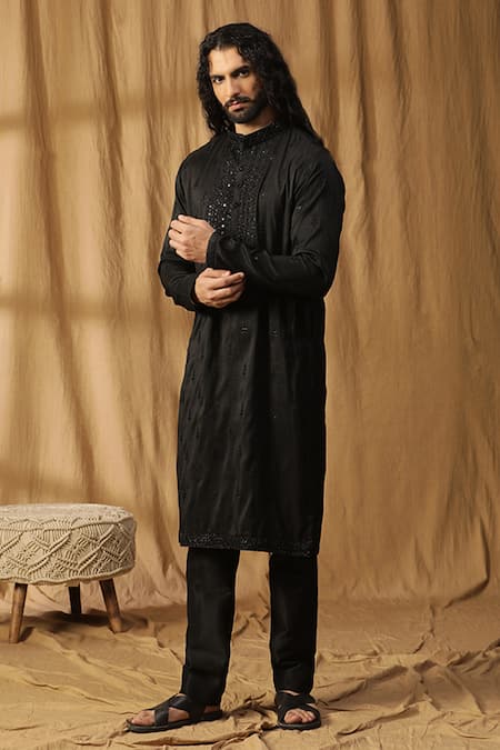 Black kurta featuring zardosi embroidery and a band collar. Paired with matching pants for a complete look.