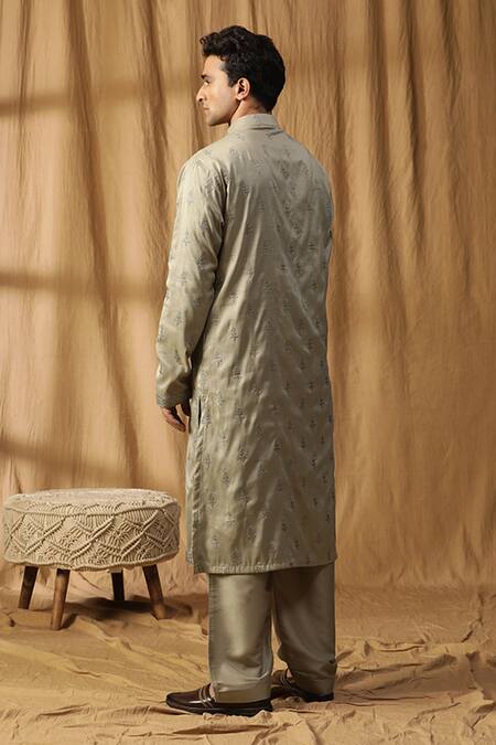 Green silk kurta featuring floral bead embroidery and a band collar. Paired with an embroidered salwar.