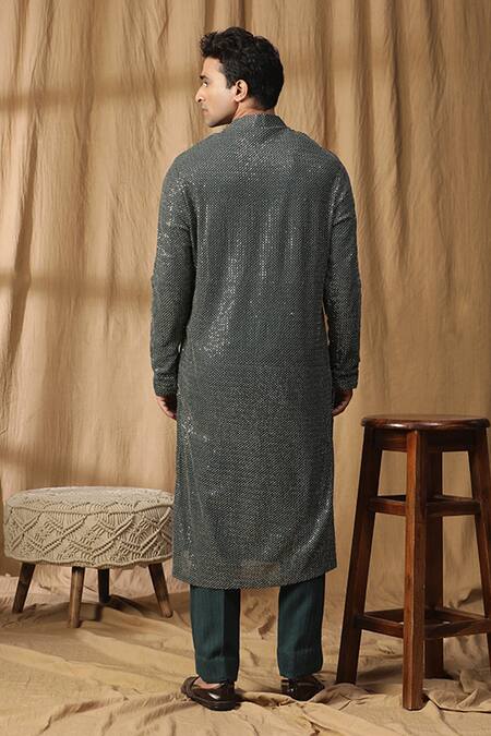 Rama green kurta featuring sequin work and a band collar. Paired with textured straight pants.