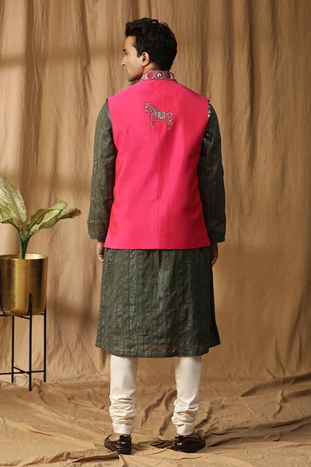 Pink silk dual toned bundi featuring ancient motif embroidery. Paired with a green kurta and off white churidar.