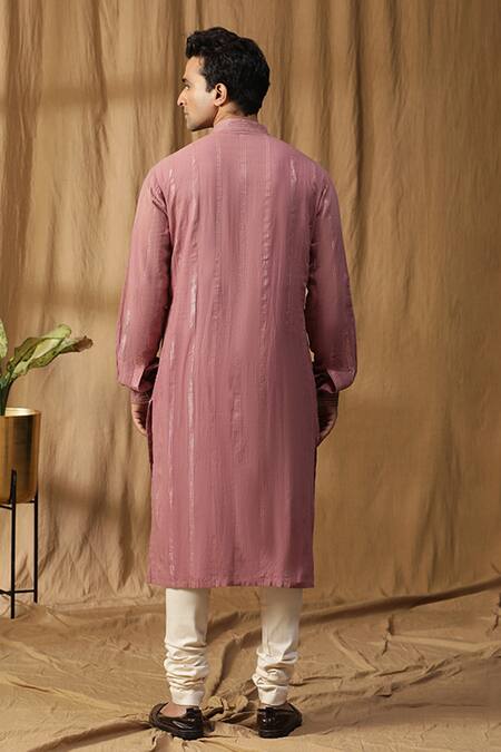Pink kurta featuring zari resham thread embroidery on the hem and cuffs. Paired with an off white churidar.