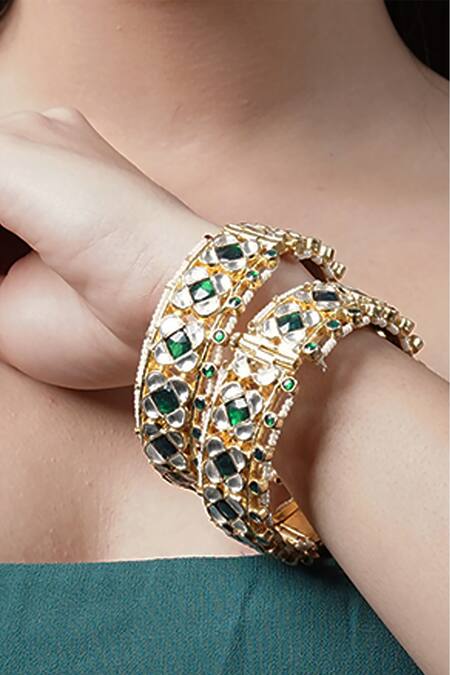 Gold plated bangles featuring intricate green kundan, polki, and pearl embellishments. The set includes two bangles with pearl detailing on the edges.