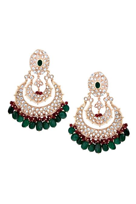 Gold chandbalis featuring intricate kundan work with pearl rims and red & green bead drops