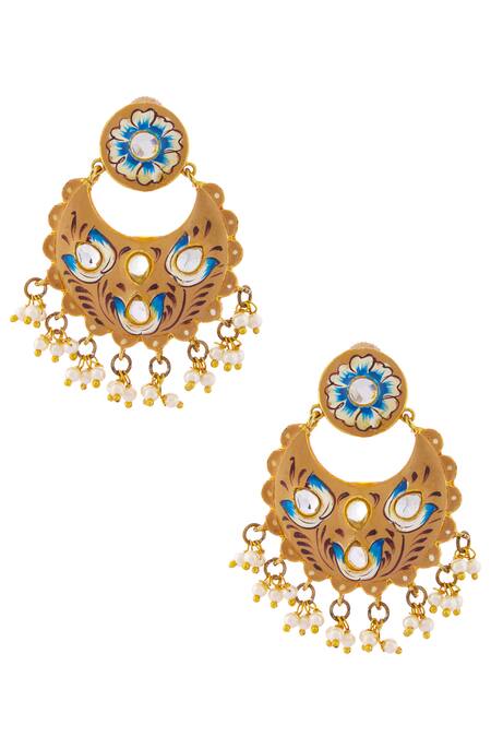 Gold-tone chandbalis with cream enamel detail, encrusted kundan & bead drops.