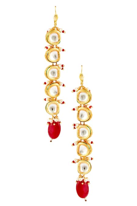Gold long earrings featuring tiered kundan drops with pearl and bead embellishments
