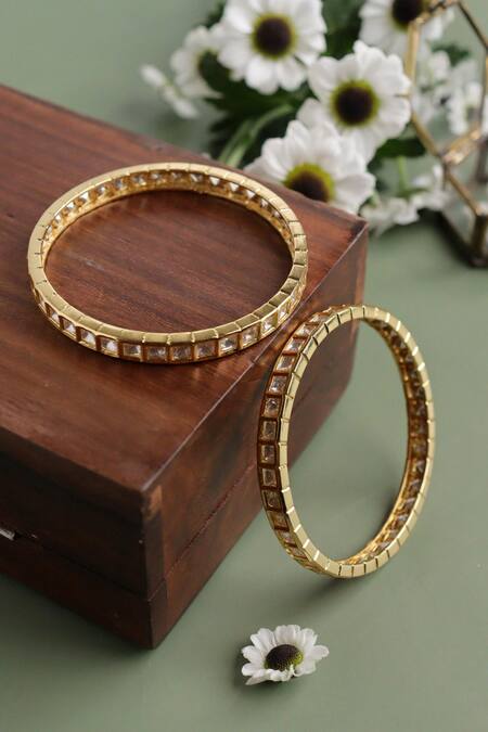 22k gold toned set of 2 bangles embellished with kundan in a checkered pattern.