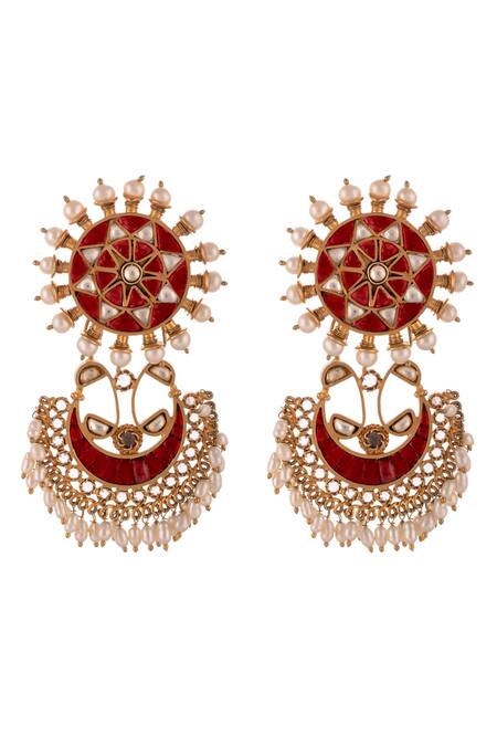 Red kundan embellishment with pearl drops, Intricate cutout detail, Push back clasp closure