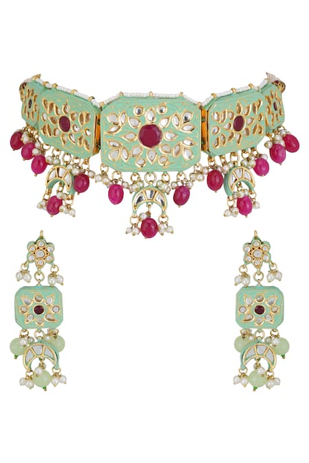 Buy_ChhavI'S Jewels_Gold Plated Stones, Beads, Embroidery Kundan Enamel Choker Set_at_Aza_Fashions