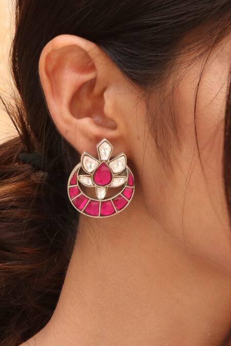 Silver earrings featuring floral top and crescent moon motif with pink and white kundan Jadau embellishments