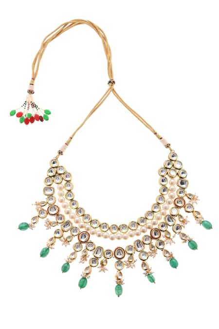 22K gold-plated layered choker featuring multi-string pearls, green stones, and encrusted kundan