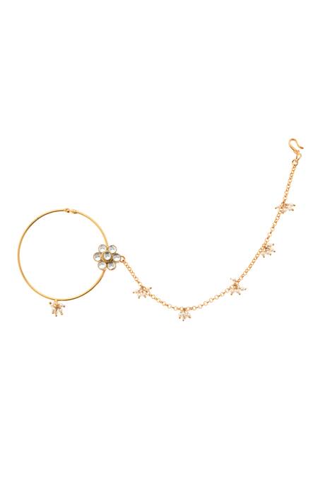 22k gold plated nath with kundan encrusted floral motif & bead chain detail.