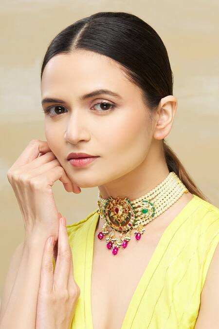 22kt gold plated multistrand pearl choker, encrusted with crescent moon kundan center, semi-precious stones and pearl clusters.