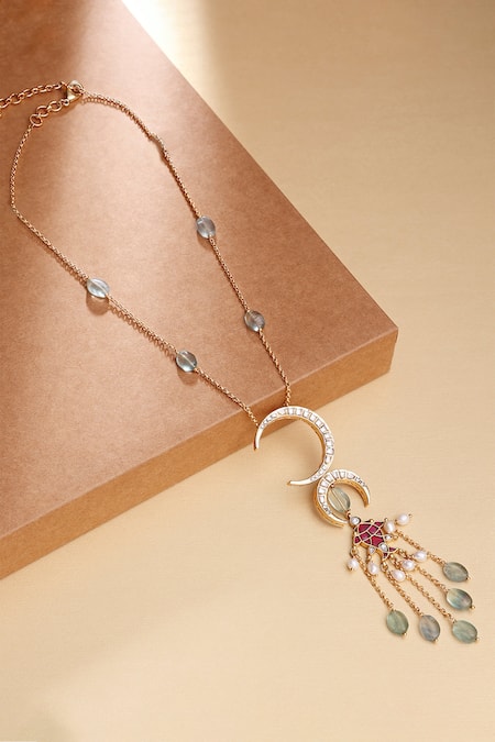 Crescent shaped pendant with tassel drops, Stone-strewn chain, Micro gold plated brass finish
