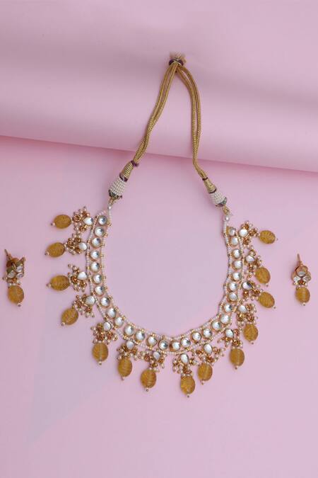 Gold necklace set featuring inverted teardrop shapes with yellow carved semi-precious stone drops and encrusted kundan. Includes a matching pair of earrings.