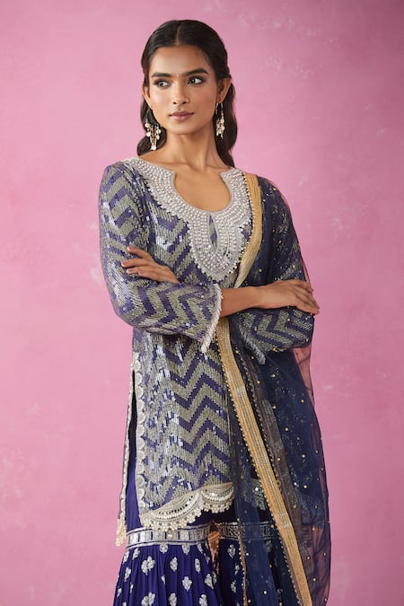 Blue kurta featuring chevron, mirror, and sequin embroidery. Paired with a gharara and dupatta adorned with sequin butti work.