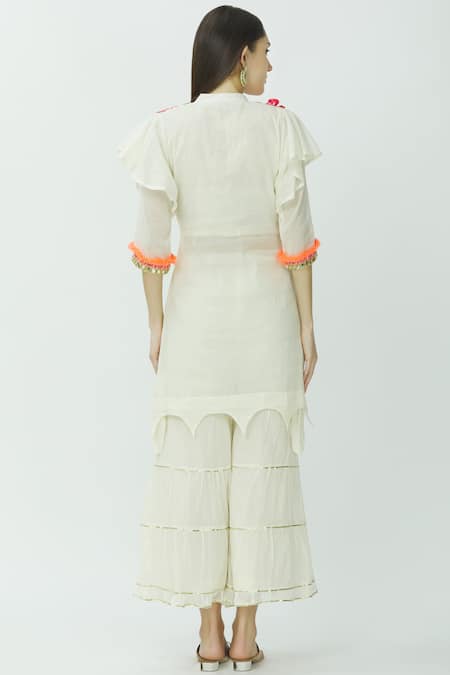 Off-white short kurta with cutwork hem, placement 3D floral motif work & frayed trim detail. Comes with tiered sharara pants & striped dupatta.