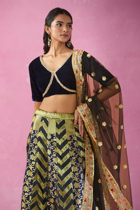 Black lehenga featuring a panelled floral banarasi pattern with attached inner lining. Paired with a padded blouse and a sequin butti work dupatta.