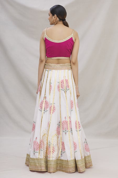 White Cotton Scoop Neck Floral Motif Lehenga Set