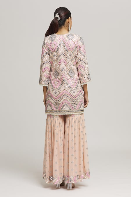 Pink kurta featuring all-over geometric embroidery with mirror and sequin work. Paired with a matching sharara and a dupatta adorned with geometric and sequin embroidery.