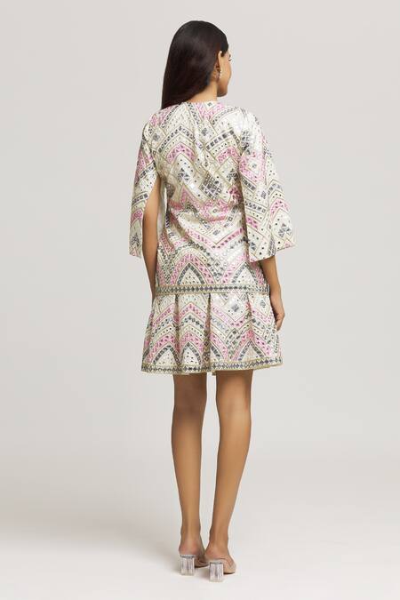 White top featuring round neckline, split sleeves, and front pearl button closure. Paired with a pleated skirt adorned with geometric hand embroidery and mirror work detailing.
