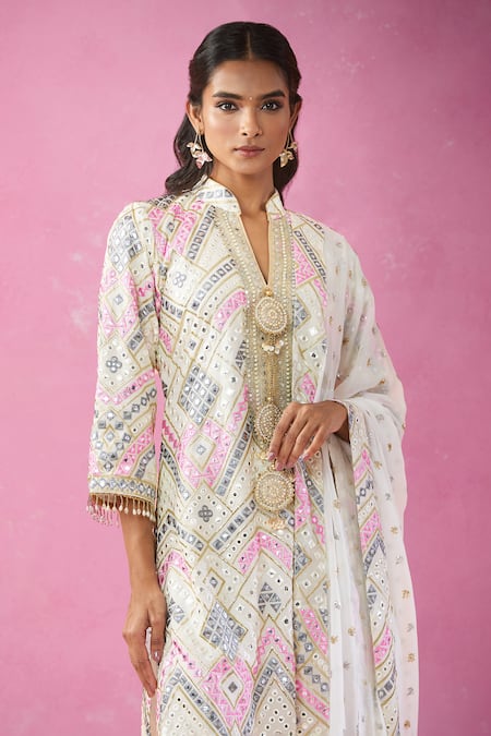 White kurta featuring geometric mirror embroidery with embroidered latkans. Paired with coordinating pant and dupatta.