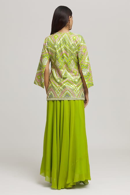Green tunic featuring all-over geometric and mirror embroidery with split sleeves. Paired with a matching flowy pleated skirt with an attached inner lining.