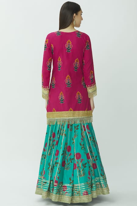 Pink short kurta with all-over floral motif work & bead tassel hem. Comes with embroidered green lehenga & striped dupatta.